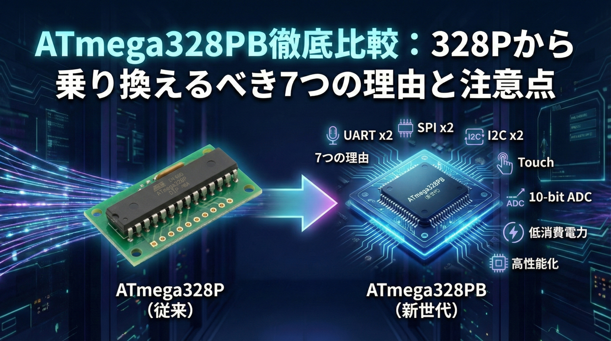 - ATmega328PBは 328Pと完全ピン互換を保ちつつ、通信×2・PWM×8・ADC×8に強化。