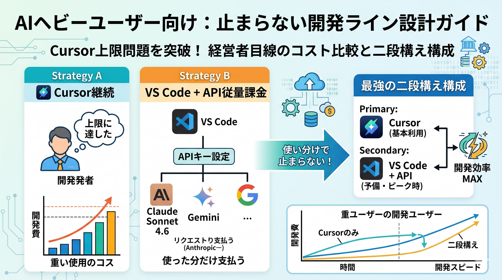 - Cursorのサブスクと、VS Code+API従量課金の「逃げ道」を二段構えで準備する。