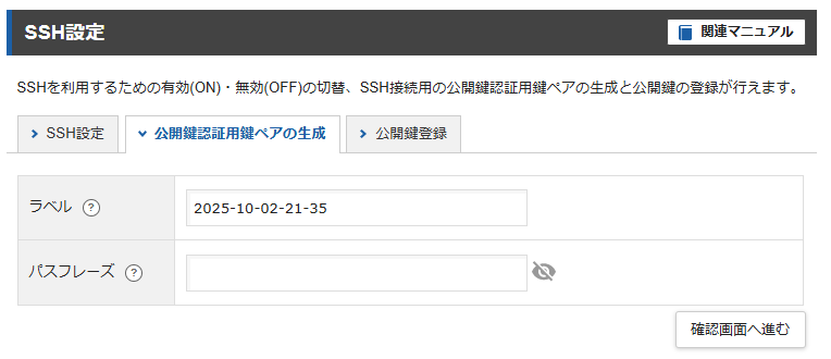 サーバーパネルに接続し、SSHをクリックし、下記の画面から公開鍵認証用鍵ペアの生成タブでパスフレーズを設定し.keyファイルをローカルにダウンロードします。